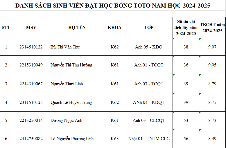 Phòng Quản lý đào tạo thông báo các sinh viên có tên trong danh sách dưới đây đủ điều kiện được nhận học bổng: