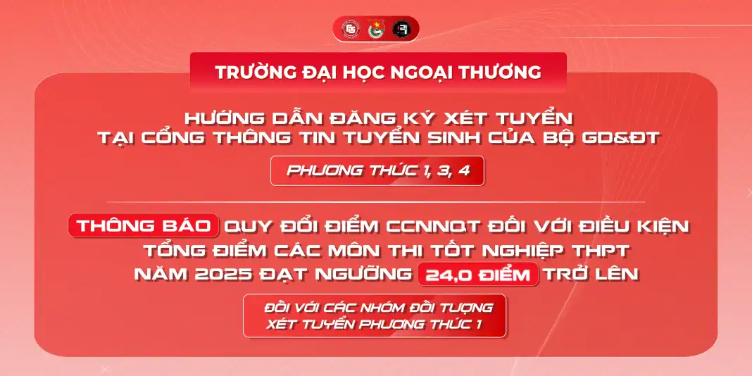 - Đối với thí sinh có CCNNQT theo quy định của Trường Đại học Ngoại thương nhưng CHƯA KÊ KHAI thông tin tại Hệ thống xét tuyển trực tuyến của Trường: Thí sinh thực hiện việc kê khai thông tin về CCNNQT để quy đổi điểm CCNNQT thay thế cho điểm thi tốt nghiệp môn ngoại ngữ tương ứng theo quy định, trước 17h00 ngày 14/7/2025, tại link sau: Link