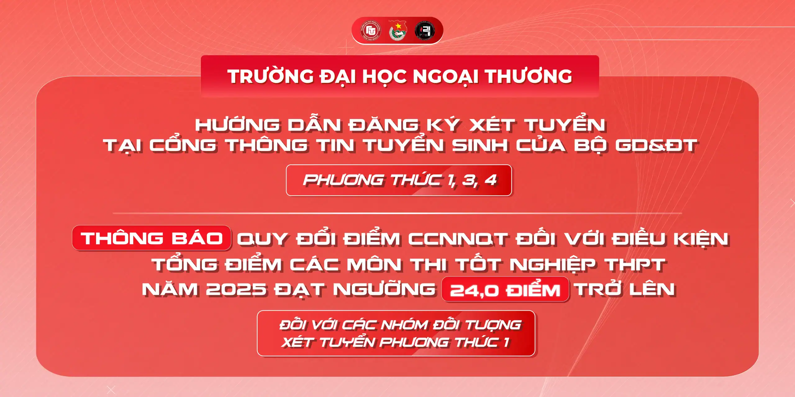 1. Hướng dẫn quy trình đăng ký xét tuyển cho thí sinh tại Cổng thông tin tuyển sinh của Bộ GD&ĐT và quy đổi điểm Chứng chỉ Ngoại ngữ quốc tế đối với điều kiện tổng điểm các môn thi tốt nghiệp THPT năm 2025 đạt ngưỡng 24,0 điểm trở lên – Phương thức 1, 3 và 4